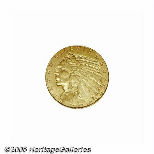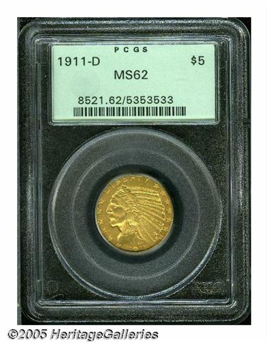 <B>1911-D<$5> MS62 PCGS.</B></I> The present sale includes a small group of extremely important Indian Half Eagles, all certified MS62 by PCGS. Each of these coins is a rarity in the series and is seldom offered in any Mint State grade. This example has subdued, silky yellow-gold luster with exceptional surfaces for the grade. It is sharply struck and attractive. Population: 35 in 62, 49 finer (5/05).