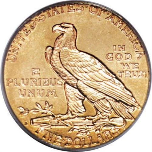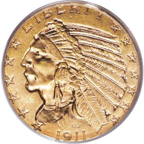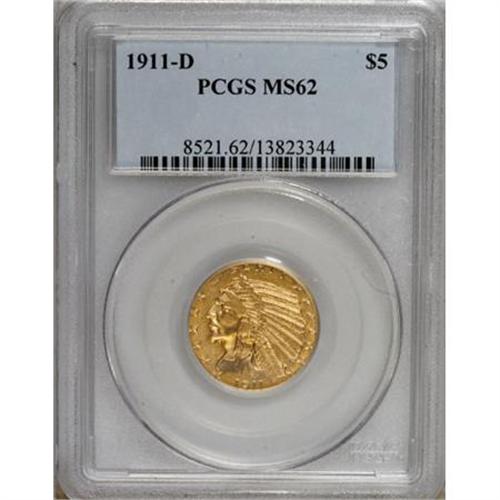 <B>1911-D $5 MS62 PCGS.</B></I> As is the case with its quarter eagle and eagle counterparts, the 1911-D five is a challenging issue whose low mintage sets it apart from surrounding dates. Only a handful of collectors sought mintmarked gold coins in 1911, and Mint State survivors with unbroken luster are scarce. This almond-gold piece is nicely struck, and is surprisingly smooth despite a single brief mark within the headdress. Population: 38 in 62, 52 finer (6/07).<BR><BR><B>Coin Engraver:</B> Bela Lyon Pratt<BR><BR><b>Shipping:</b> Coins & Currency (<a target="_blank" href="http://www.heritageauctions.com/common/shipping.php">view shipping information</a>\)