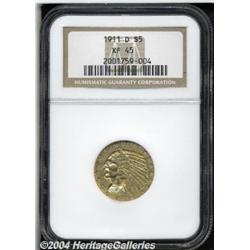 <B>1911-D<$5> XF45 NGC.</B></I> A scarce and underrated issue that is very elusive in mint condition, this piece representing excellent value for the grade. Well defined overall with light friction over the highpoints.<BR><I>From The Garden State Collection.</B></I> <BR><BR><B>Important notice:</B> Heritage usually auctions material at the rate of 200-250 lots per hour. On some occasions eBay Live bid software or the Internet may not be able to keep up with the pace of the auction. We recommend placing a realistic absentee bid now as insurance to avoid disappointment. Occasionally the auctioneer may eliminate or reject an eBay Live bid, and the auctioneer may also reopen a lot after the close of the eBay live bidding (usually because we missed an audience bid), and may reject your bid even if it shows you as the winning bidder. By bidding via eBay Live, you agree that Heritage may award the lot to another bidder at its sole discretion under the circumstances described above or any other reasonable circumstances. Since eBay bids are not shown to us until we open the lot on the floor, we treat those bids just like floor bids. In most cases the floor responds before the eBay bid is presented to us, due to Internet lag time, so for consistency we have made it a policy that floor bids are always considered first over tie eBay live bids. Also please note that all Heritage lots purchased through eBay Live carry a 20% Buyer's Premium. Please make sure you read the Terms and Conditions before you bid.