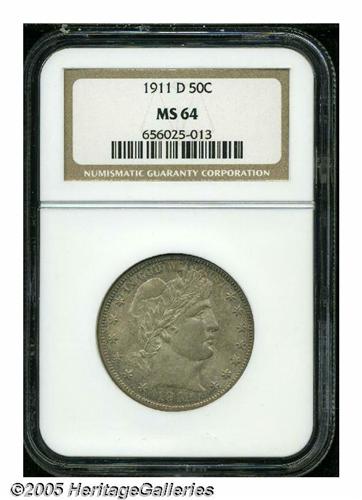 <B>1911-D<50C> MS64 NGC.</B></I> Well struck with an opaque layer of brown-gray toning over both sides, augmented by reddish field accents and darker speckled coloration near the borders. Both sides seem abrasion-free, with vibrant luster beneath the rich patina. Population: 18 in 64, 17 finer (5/05).