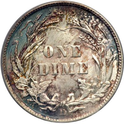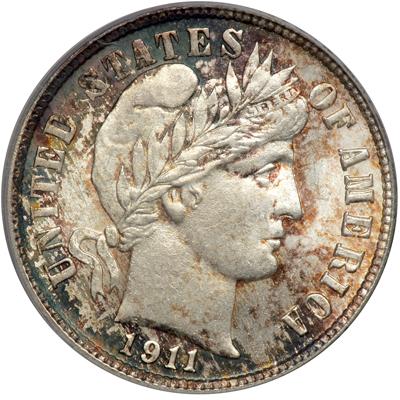 1911-D Barber Dime. PCGS graded MS-66. Frosty with nice golden and blue toning. Pop 36; 7 finer in 67 (PCGS # 4858).
