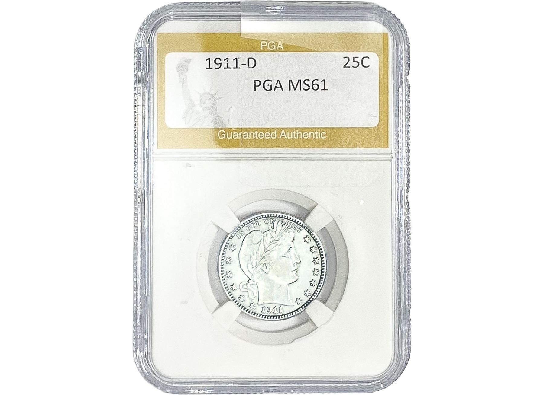 COINS AND CURRENCY LISTED IN GSA’S CATALOG AS GRADED AND ENCAPSULATED BY PCGS, NGC, ANACS, ICG, PCGS CURRENCY, PMG, PCGS BANKNOTE GRADING, CMC OR ANY OTHER THIRD-PARTY GRADING SERVICE ARE LIKEWISE SOLD “AS-IS” EXCEPT AS EXPRESSLY SET FORTH HEREIN. ALL THIRD-PARTY GRADING SERVICE GUARANTEES, INCLUDING AUTHENTICITY, ARE THE SOLE RESPONSIBILITY OF THE THIRD-PARTY GRADING SERVICE AND NOT WARRANTIES OR GUARANTEES OF GSA. BIDDERS SHOULD CONTACT THESE THIRD-PARTY GRADING SERVICES DIRECTLY WITH RESPECT TO ANY CLAIMS OR QUESTIONS THEY MAY HAVE CONCERNING THEIR GUARANTEES AND WARRANTIES. BIDDERS ACKNOWLEDGE AND AGREE THAT AUCTIONEER IS NOT BOUND BY OR LIABLE FOR ANY OPINION OR CERTIFICATION BY ANY THIRD-PARTY GRADING SERVICE. REMOVAL OF A PRODUCT FROM ITS PROTECTIVE CASING OR HOLDER OR ALTERATION OF ANY COIN HOLDER WAIVES ALL RIGHTS CONCERNING THE PRODUCT CONTAINED THEREIN.