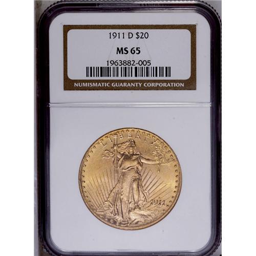 <B>1911-D/D<$20> MS65 NGC.</B></I> Breen-7383. The mintmark is widely repunched, although not designated as such on the NGC holder. A lustrous orange-gold Gem. Precisely struck and void of mentionable marks.