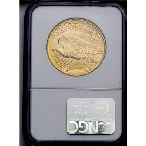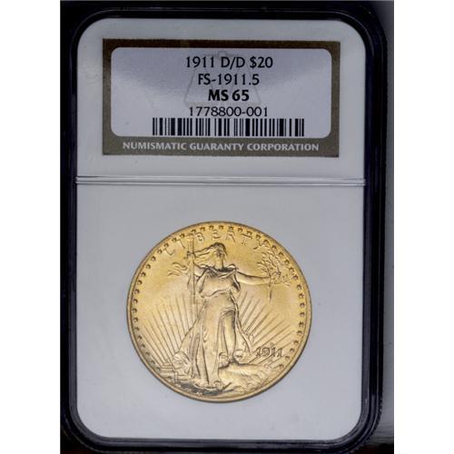 <B>1911-D/D<$20> MS65 NGC.</B></I> FS-1911.5. A lustrous honey-gold Gem, boldly struck and beautifully preserved save for a couple of small marks on the sun, which are distant from the focal points. The mintmark is sharply repunched to the east.