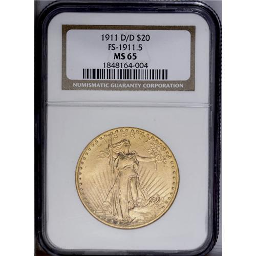 <B>1911-D/D<$20> MS65 NGC.</B></I> FS-1911.5. The mintmark is nicely repunched to the right. This intricately struck Gem features unbroken luster and rich peach-golden toning. A charming example of this interesting die variety.