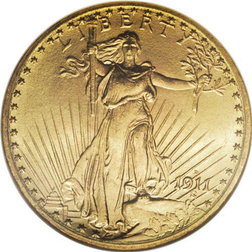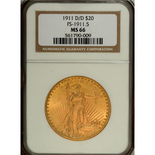 <B>1911-D/D $20 MS66 NGC.</B></I> FS-1911.5, Breen-7383. A secondary mintmark is quite evident east of the primary D. Fine-grained surfaces exhibit intense luster and pretty apricot-gold color that is subtly laced with tinges of light green. An impressive strike makes itself known with sharp detail on Liberty's face, fingers, and toes, on the panes of the Capitol building, and in the eagle's plumage. Impeccably preserved reveal one small pedigree marker - a small mark on the ray above the S in TRUST.<BR><BR><b>Shipping:</b> Coin/Currency (<a target="_blank" href="http://www.heritageauctions.com/common/shipping.php">view shipping information</a>)