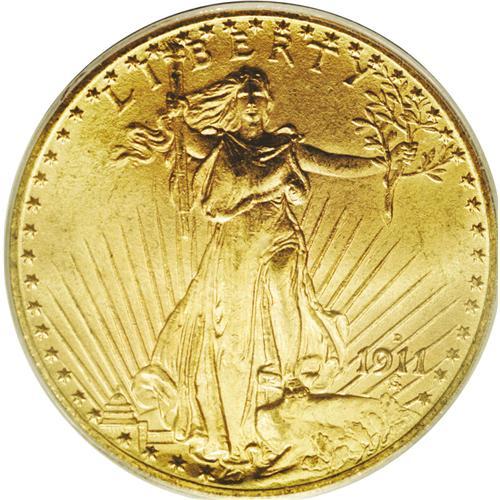 <B>1911-D/D<$20> MS66 PCGS.</B></I> Breen-7383. Repunched Mintmark. Inexplicably certified by PCGS as a "Mint Error." This is correctly termed a variety, and in no way is it a mint error. According to Breen, this variety with the doubled mintmark is quite rare. As a date, the issue is also rare in high grades with just nine finer examples. Sharply struck with satiny orange-gold luster and good eye appeal.