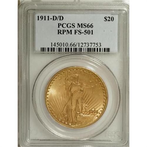 <B>1911-D/D $20 RPM FS-501 MS66 PCGS.</B></I> A gorgeous Premium Gem representative of this popular Saint-Gaudens repunched mintmark variety, well-defined with elegant, satiny luster that enlivens peach-gold and yellow-orange surfaces. Beautifully preserved and undeniably appealing. One of just two MS66 examples certified by PCGS as the FS-501 variant, with none finer (3/08). A numerically equivalent coin from the Morse Collection is listed as an important auction appearance by Garrett and Guth (2006).<BR><BR><b>Shipping:</b> Coins & Currency (<a target="_blank" href="http://www.heritageauctions.com/common/shipping.php">view shipping information</a>)