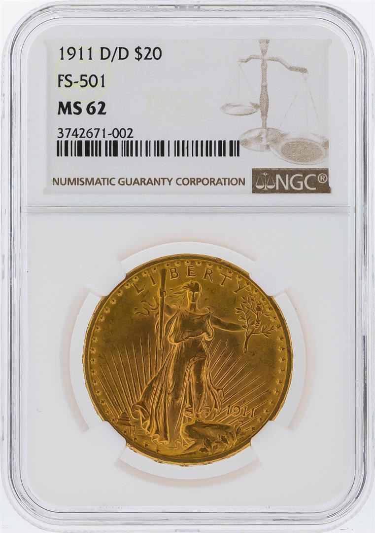 One 1911 D/D $20 St. Gaudens Gold Coin NGC Graded MS62. NGC Certified.