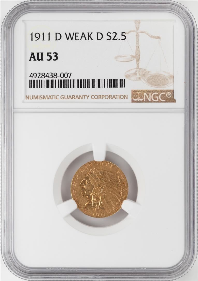 One 1911-D Weak D $2 1/2 Indian Head Quarter Eagle Gold Coin NGC AU53. NGC Certified.