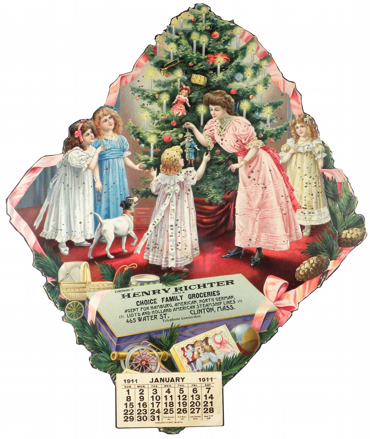 1911 Embossed Die Cut Calendar. Compliments of Henry Richter dealer in Choice Family Groceries, Clinton, Mass. Christmas motif. Very slight paper loss at 3/9:00 otherwise excellent condition. 17 X 20 inches.