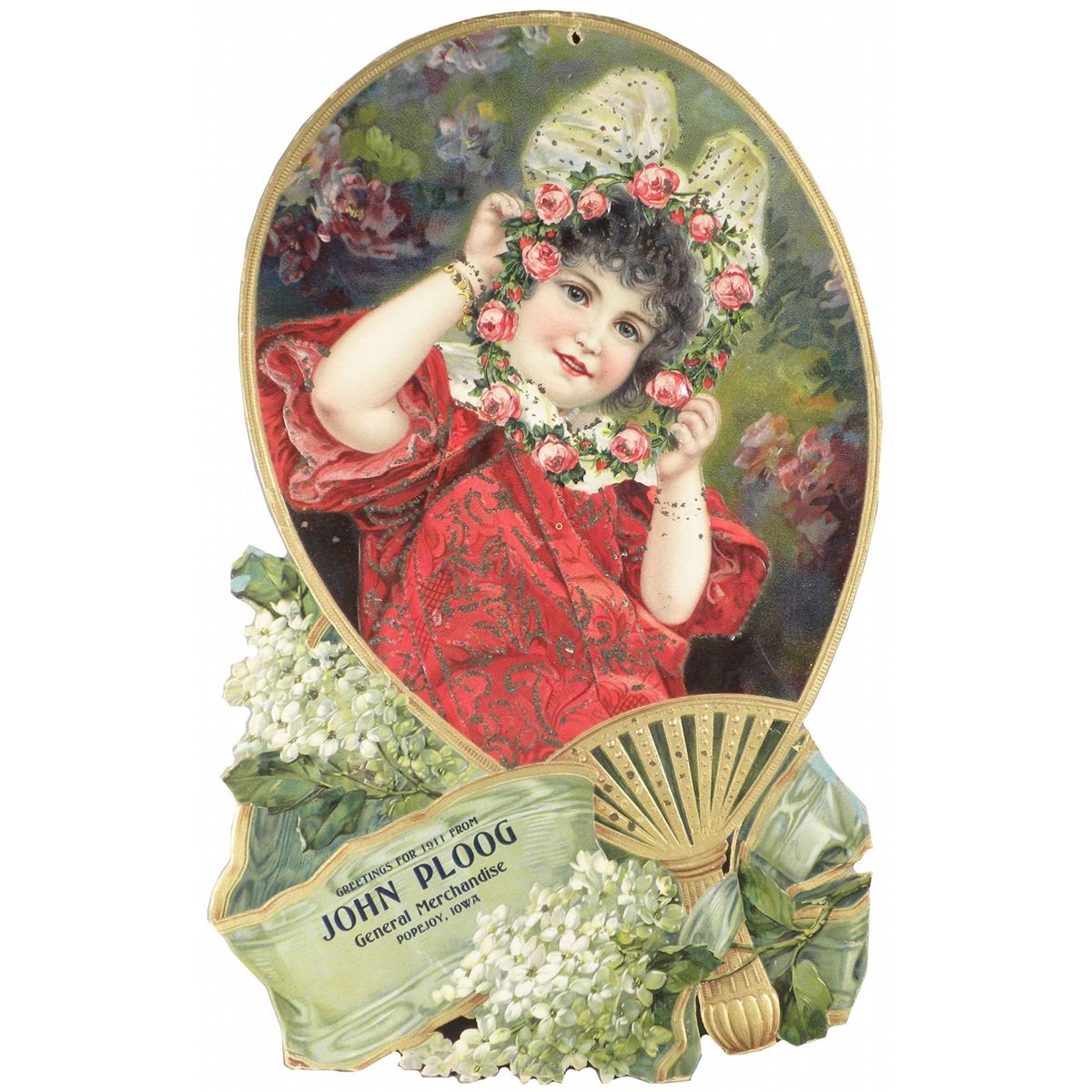 Embossed Die Cut Sign. Greetings for 1911 from John Ploog, General Merchandise, Popejoy, Iowa. Calendar pad missing. Near mint condition. 10 1/2 X17 inches.