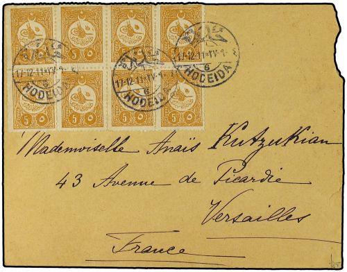 1911 Envelope to FRANCE bearing Turkey 5 para bistre (8) (Yvert 145) tied by HODEIDA Nº 6 (Coles & Walker Type 71) datestamp in black routed via Aden with FRENCH arrival. A scarce multiple franking.
