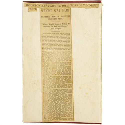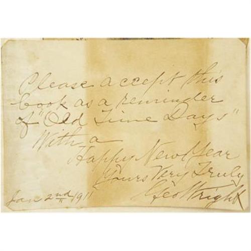 <B>1911 George Wright Signed Book Dedication.</B></I> On April 22, 1876, George Wright became the first batter in National League history, serving as the Boston Red Caps' lead-off man and grounding out to the shortstop of the Philadelphia Athletics. Thirty-five years later, this Hall of Fame baseball pioneer made a gift of this hardcover edition of <I>The National Game</B></I> to an admirer, writing on a small (3x4.5") sheet affixed to an opening blank page, "Please accept this book as a reminder of 'Old Time Days' with a Happy New Year, Yours Very Truly, Geo. Wright, Jan 2nd, 1911." The black fountain pen ink remains wonderfully bold almost a century later, rating a legitimate 9/10 in strength. A column of toning affecting the dedication results from decades pressed against a yellowing newspaper column glued to the facing page recounting Wright's visit to Houston, Texas that gave birth to this treasure. The book itself shows some slight loosening of the binding and an expected degree of wear to the covers and spine, but nothing that troubles the all-important autograph. A tough and essential autograph for the avid baseball historian, provided with the finest provenance one could imagine for a signature of this vintage. <I>LOA from PSA/DNA. LOA from James Spence Authentication.</B></I><BR><BR><b>Shipping:</b> Books & Catalogs (<a target="_blank" href="http://www.heritageauctions.com/common/shipping.php">view shipping information</a>)