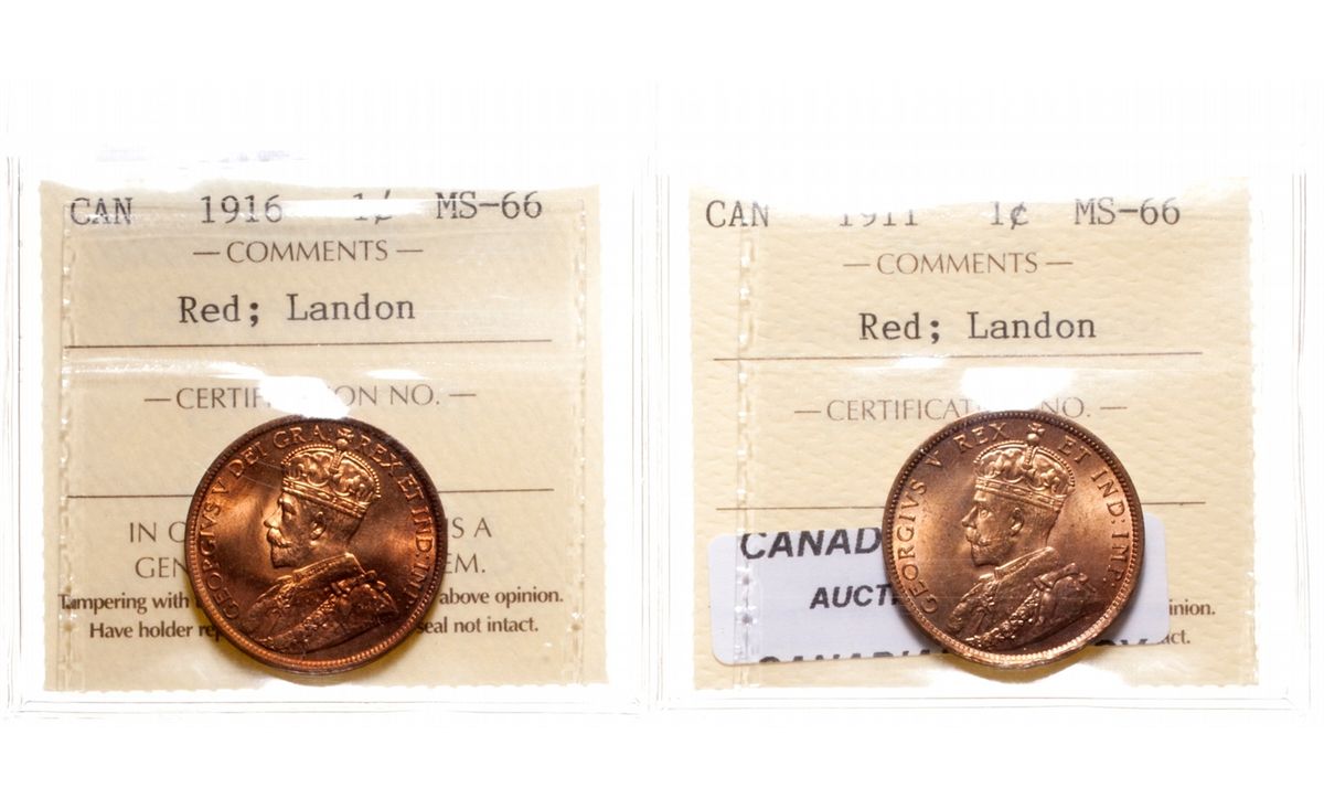 1911. ICCS Mint State-66. Red. 95% even red-orange luster; 1916. ICCS Mint State-66. Red. 90% even red-orange luster. Lot of two (2) Gems.