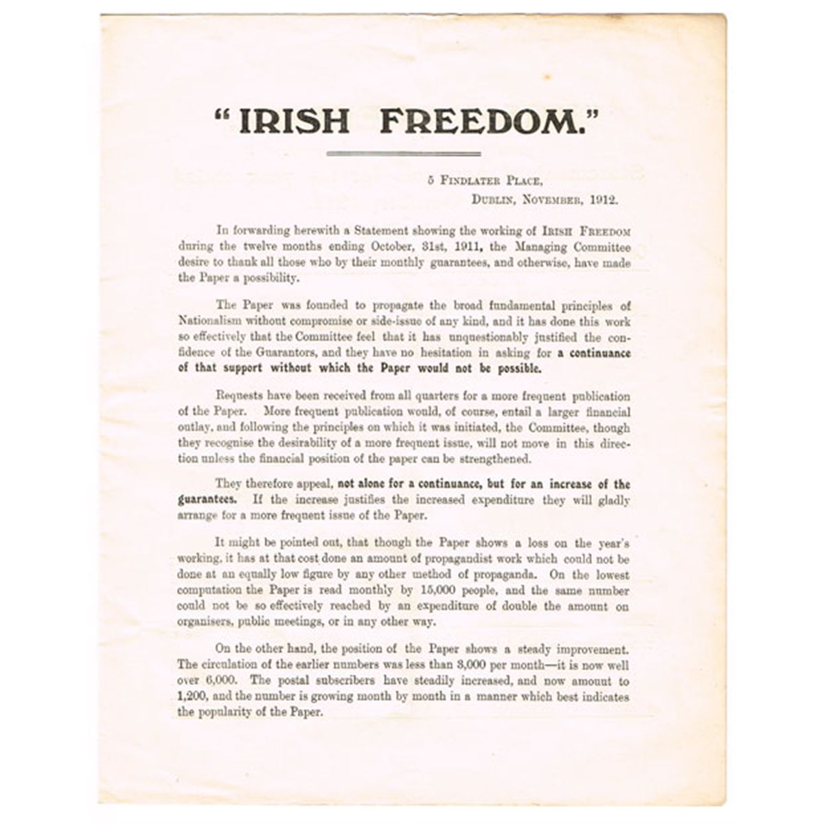 Statement of accounts of the Irish Freedom newspaper for the year ending 31 October 1911. Circulated amongst guarantors. Printed by Devereux, Newth & Co. Dublin. 'Irish Freedom' was the monthly publication of the Irish Republican Brotherhood.