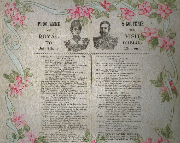 Single printed sheet titled "Programmes & Souvenir of Royal Visit to Dublin". Decorated with a floral border and portraits of the King and Queen and with details of the carriage procession from Kingstown to the Castle and the series of events that would take place.