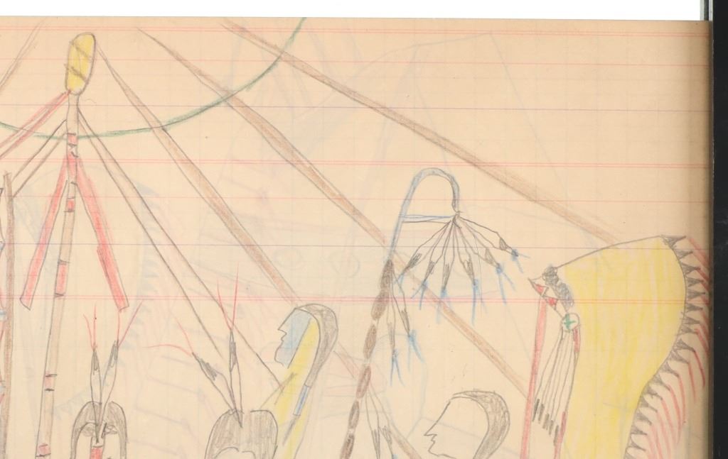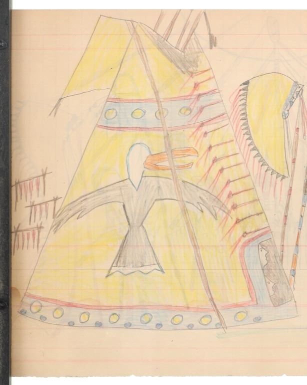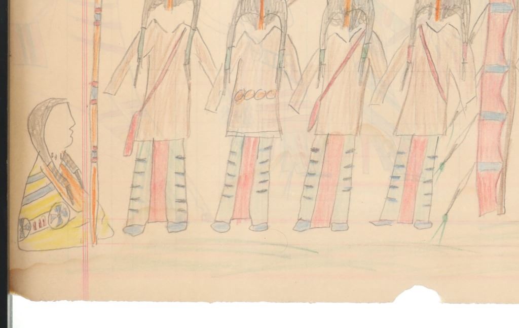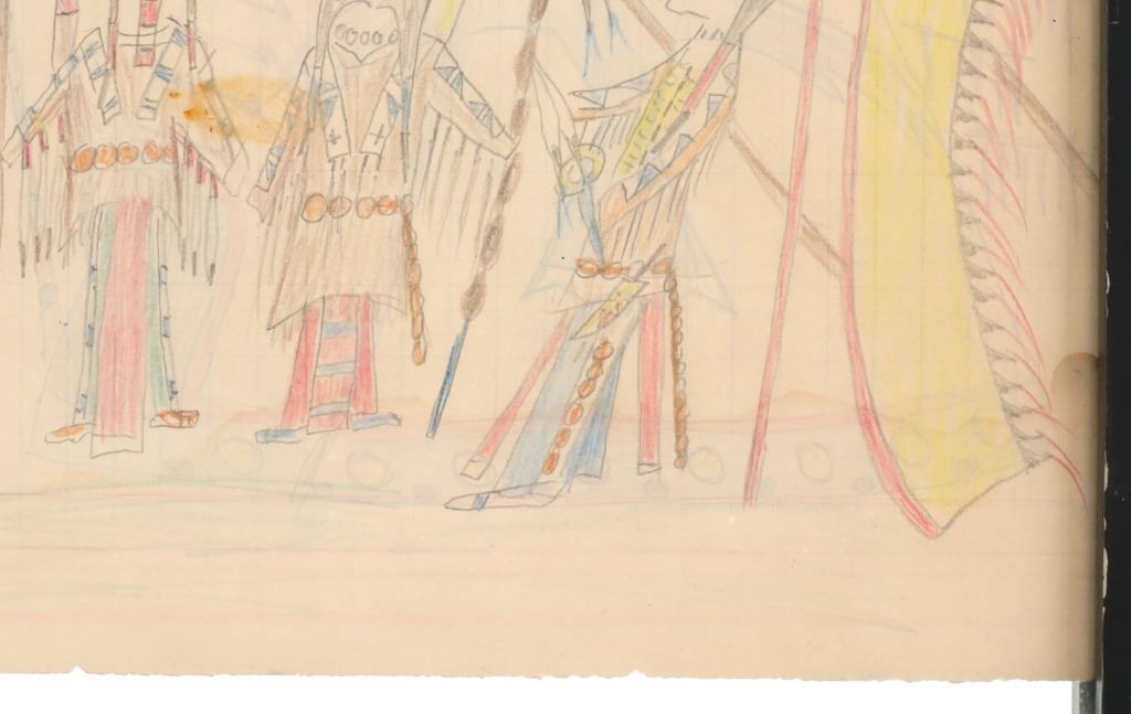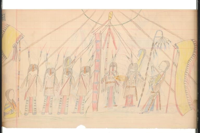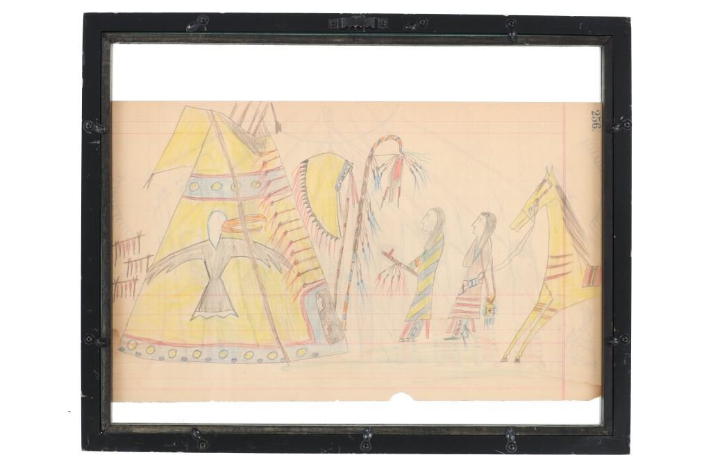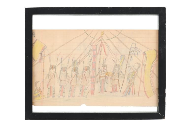 The lot features a double-sided original set of ledger drawings from the Northern Sioux of the rare Sun Dance dating to circa 1911-1940’s from the Robert Dickens Little Blue Hand collection. These ledger drawings are from the same ledger book collection offered and sold from our company back in 2013. The original ledger book would have been traded to the Northern Sioux and was said to be handed down from their ancestors at the Sioux Pine Ridge Indian Reservation and later traded to the collector many years ago back in the 1970-1980’s. The set ranging in age from circa 1890 on and is mostly believed to be drawn in circa 1920-1940’s. The ledger art shows an unmarked ledger accounting sheet, likely from Sam Lievine and shows the iconic Lakota Sioux Sun Dance. The first image shows the large lodge with the pole at the center having the dancers attached to the central pole with two hooks at his breast and leaning back, his elders and chief sit around him. The image shows the Sioux in full dress with two large feathered headdresses on either side, a wearing blanket, war shirt and large coup stick. The other side shows two Lakota Sioux men with wearing blankets having a pipe in hand walking up to the tipi lodge which is wonderfully painted with Sioux patterns and a large Eagle. Presumably the lodge the Sun Dance is taking place in. The image shows a painted war horse, a large coup stick, feathered headdress, signal mirror bag. The condition of this framed ledger art is good with very slight wear to the frame and some wear to the edges of the artwork but otherwise shows good well preserved condition. The measurements of this framed ledger art is 15” by 12.25" and the visible artwork measures 13 5/8”” by 8.5”.