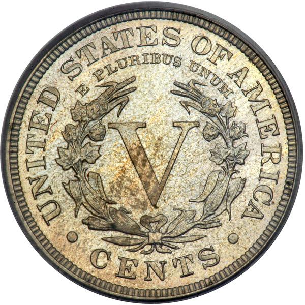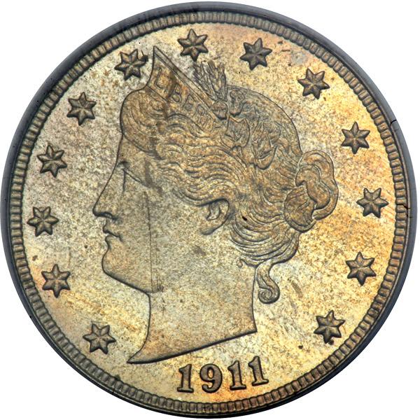 1911 Liberty Nickel. PCGS graded Proof 64. Light golden toning, slightly iridescent with fly specks scattered about. Bold detail (PCGS # 3909) .