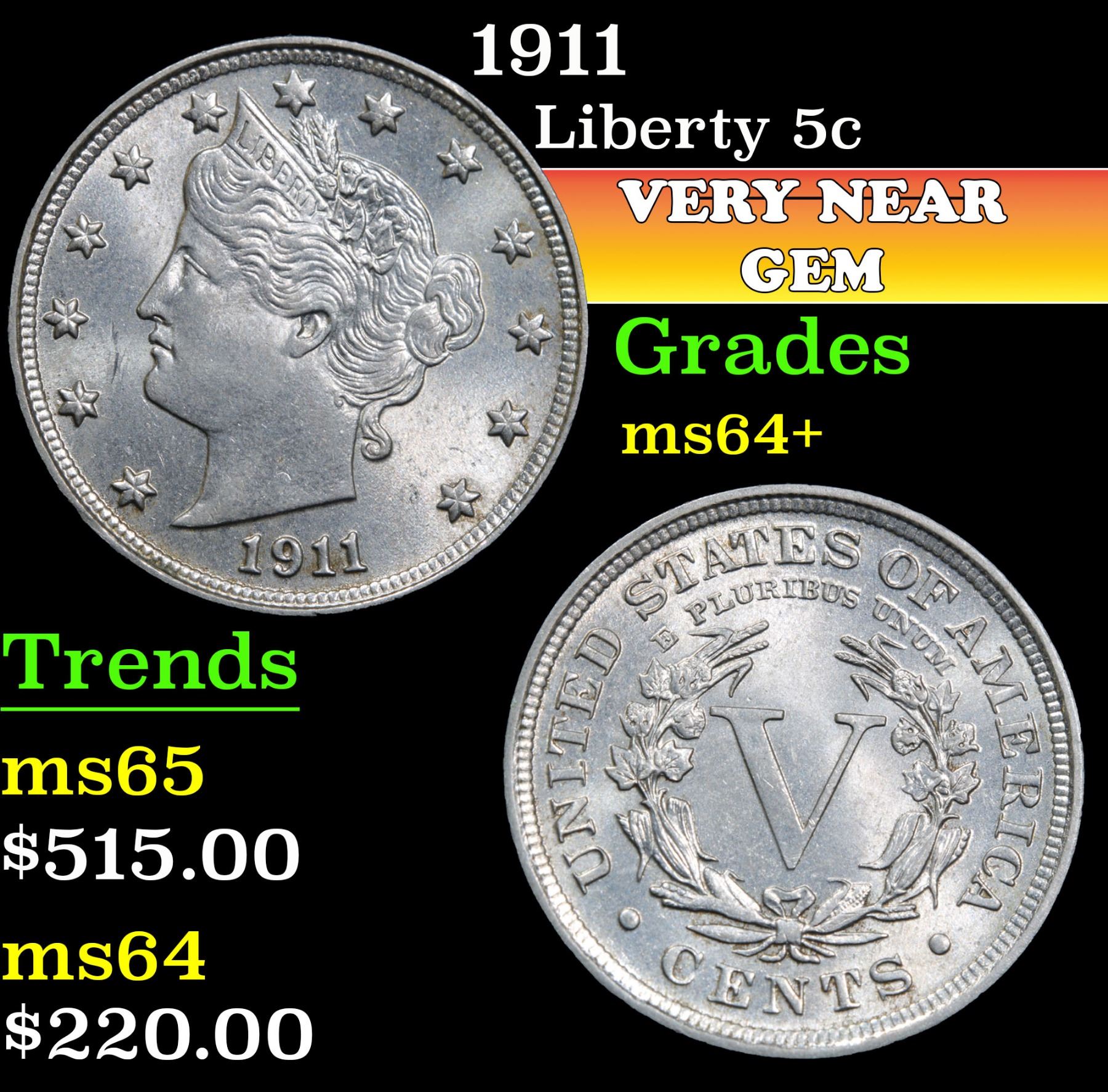1911 . . Liberty Nickel 5c Grades Choice+ Unc.