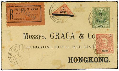 1911 MACAO a HONG KONG. 2 avos, 4 avos y 6 avos. s. 10 reis. Raro franqueo.