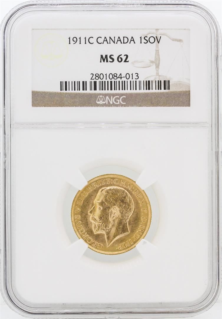 One 1911 NGC MS62 Canada 1SOV Gold Coin. NGC Certified.