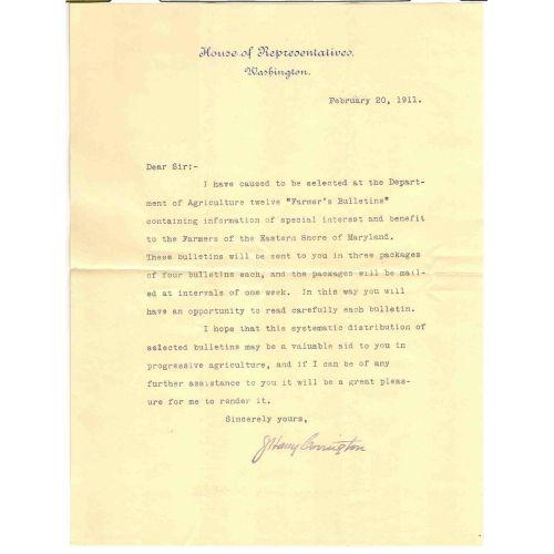 1911 U.S. REPRESENTATIVE J. HARRY COVINGTON (MARYLAND) LETTER. Typewritten letter from Rep. Covington to William E. Liden of Federsalsburg, Maryland announcing that farmer’s bulletins will be sent to him. Stamped signature at bottom. Letter is on U.S. House of Representatives letterhead and comes with cover.