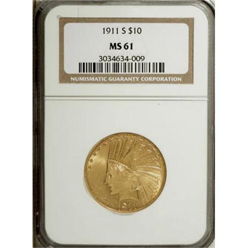 <B>1911-S $10 MS61 NGC.</B></I> Soft yellow-gold and canary-gold shadings grace this unworn and well struck piece. The slightly granular surfaces show a number of light abrasions, including several on the portrait.<BR><BR><B>Coin Engraver:</B> Augustus Saint-Gaudens<BR><BR><b>Shipping:</b> Coins & Currency (<a target="_blank" href="http://www.heritageauctions.com/common/shipping.php">view shipping information</a>)