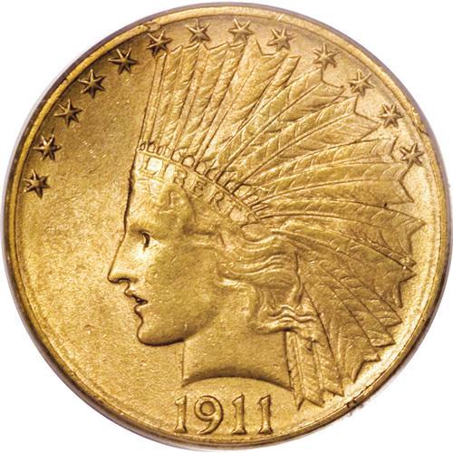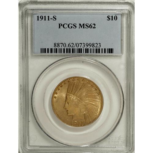 <B>1911-S $10 MS62 PCGS.</B></I> Both sides of this brilliant yellow-gold piece are fully lustrous with hints of pink toning. Slight abrasions on each side are consistent with the grade that is assigned by PCGS. This lovely eagle is difficult to locate in any Mint State grade. Population: 22 in 62, 68 finer (2/07).<BR><BR><b>Shipping:</b> Coins & Currency (<a target="_blank" href="http://www.heritageauctions.com/common/shipping.php">view shipping information</a>)