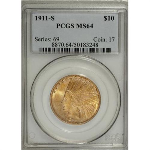<B>1911-S $10 MS64 PCGS.</B></I> The instantly appealing surfaces provide a visual treat, in the form of gorgeous luster awash over the reddish-gold surfaces. Although a few small abrasions preclude a Gem grade, they fail to dampen enthusiasm for the piece. While Walter Breen (1988) reported that Uncirculated survivors are "mostly from a small hoard said to number 60 pieces, found in the Philippines ca. 1976," Garrett and Guth more recently said, "This date was virtually on par with the rarity of the 1911-D issue until the discovery of a small hoard in Europe in the 1970s." Population: 28 in 64, 28 finer (3/08).<BR><BR><B>Coin Engraver:</B> Augustus Saint-Gaudens<BR><BR><b>Shipping:</b> Coins & Currency (<a target="_blank" href="http://www.heritageauctions.com/common/shipping.php">view shipping information</a>)