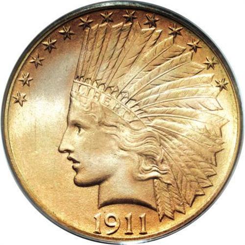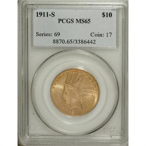 <B>1911-S $10 MS65 PCGS.</B></I> The 1911-S ten dollar piece, with a mintage of just 51,000 pieces, is a scarce issue, but not the major rarity it was thought to be before the discovery of a hoard of 60 pieces in the Philippines about 1976.<BR> Still, probably no more than 400 1911-S eagles are believed known in all grades, with most in Extremely Fine to About Uncirculated condition. A little more than 40 Gem pieces have been graded by PCGS and NGC, with none finer than MS66!<BR> This MS65 coin displays beautiful apricot-gold patina laced with traces of mint-green. Fabulous luster exudes from both sides, and all of the design elements are exquisitely brought up. This coin would have certainly graded even higher were it not for a few unobtrusive marks. Population: 20 in 65, 8 finer (11/07).<BR><BR><B>Coin Engraver:</B> Augustus Saint-Gaudens<BR><BR><b>Shipping:</b> Coins & Currency (<a target="_blank" href="http://www.heritageauctions.com/common/shipping.php">view shipping information</a>)