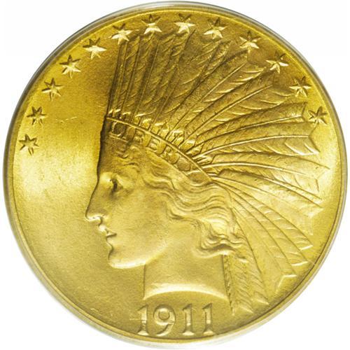 <B>1911-S<$10> MS66 PCGS.</B></I> In absolute terms, probably no more than 400 1911-S eagles are believed known in all grades, with the majority of those in XF-AU condition. Fewer than 200 Mint State specimens have been certified by PCGS and NGC, though many of these are undoubtedly resubmissions. At least 40 to 60 of these Uncirculated pieces were uncovered in Europe in the late 1970s. A total of 30 MS65 coins have been certified, as have just ten Premium Gems, and none finer.<BR> The finely granular surfaces of the Premium Gem example in the current lot display intense luster and orange-gold patination. The Indian's hair reveals excellent definition, as do the feathers in the headdress and on the eagle. Immaculately preserved surfaces display a minute mark to the right of star 2, another on the left bust truncation, and a couple of more hidden on the eagle's head, all of which are mentioned for pedigree purposes. Population: 8 in 66, 0 finer (3/06).<BR><I>Indian Eagle Selections from the Dr. Steven L. Duckor Collection.</B></I> <BR><BR><B>Important notice:</B> Heritage usually auctions material at the rate of 200-250 lots per hour. On some occasions eBay Live bid software or the Internet may not be able to keep up with the pace of the auction. We recommend placing a realistic absentee bid now as insurance to avoid disappointment. Occasionally the auctioneer may eliminate or reject an eBay Live bid, and the auctioneer may also reopen a lot after the close of the eBay live bidding (usually because we missed an audience bid), and may reject your bid even if it shows you as the winning bidder. By bidding via eBay Live, you agree that Heritage may award the lot to another bidder at its sole discretion under the circumstances described above or any other reasonable circumstances. Since eBay bids are not shown to us until we open the lot on the floor, we treat those bids just like floor bids. In most cases the floor responds before the eBay bid is presented to us, due to Internet lag time, so for consistency we have made it a policy that floor bids are always considered first over tie eBay live bids. Also please note that all Heritage lots purchased through eBay Live carry a 20% Buyer's Premium. Please make sure you read the Terms and Conditions before you bid. This lot is being auctioned in conjunction with a live floor auction by Heritage Galleries & Auctioneers. All final auction and invoice information will be supplied by Heritage Galleries & Auctioneers, and all other information should be considered preliminary. Lot:3890 <BR><BR><B>Winning Notification and Billing:</B> After the FINAL session in this auction is complete, Heritage will send e-mail and snail mail invoices. This process normally takes several days. All final auction and invoice information will be supplied by Heritage Galleries & Auctioneers, and all other information should be considered preliminary. <BR><BR>This auction will be conducted on a live auction floor and over the Internet through eBay Live. If you choose to place an absentee bid, please take a moment to <font color='#0000ff'><u><a href='http://pages.ebay.com/liveauctions/help/before/laabsentee.html'>learn how eBay Live absentee bidding works</a></u></font><font color='#000000'>
