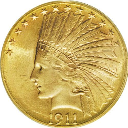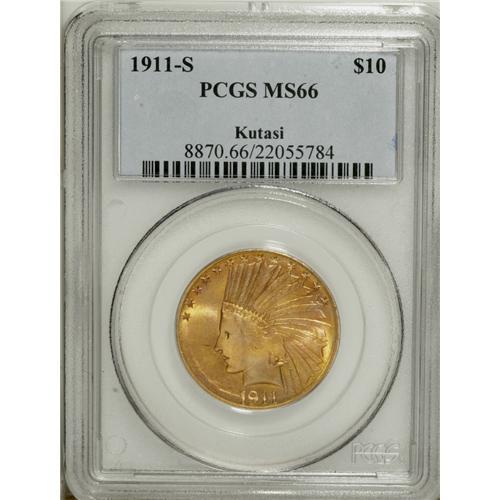 <B>1911-S $10 MS66 PCGS.</B></I> The story of the 1911-S ten dollar is a fascinating one and it is told in its entirety in the new book <I>The Coinage of Augustus Saint-Gaudens as Illustrated by the Morse Collection.</B></I> This date was formerly a major rarity until a Catalan-speaking coin dealer approached Marc Emory in 1979 about 1911-S tens at a coin show in Basel, Switzerland. He eventually purchased 50 examples for $60,000. Most of the coins were high grade and according to Emory, " ... some of which were pristine Gems. All were Mint State with the same light patina over them."<BR> "Light patina" does not accurately describe the color present on this particular coin. Both sides exhibit deep red color with strong underlying mint frost. The surfaces show pronounced granularity which gives a randomly dispersive appearance to the thick mint frost. The only mark of note is located on the reverse, a horizontal abrasion in the field below the final A in AMERICA. Only 10 coins have been certified MS66 by the two major services (eight by PCGS and two by NGC), with none finer (11/06). This is a rare opportunity to acquire one of the finest preserved 1911-S tens known.<BR><I>From The Kutasi Collection.</B></I><BR><BR><b>Shipping:</b> Coin/Currency (<a target="_blank" href="http://www.heritageauctions.com/common/shipping.php">view shipping information</a>)