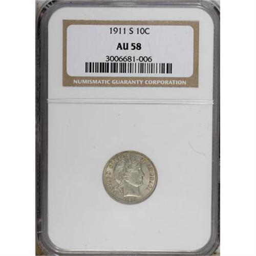 <B>1911-S 10C AU58 NGC.</B></I> NGC Census: (9/146). PCGS Population (16/196). Mintage: 3,520,000. Numismedia Wsl. Price for NGC/PCGS coin in AU58: $108. (#4859)<BR><BR><b>Shipping:</b> Coins & Currency (<a target="_blank" href="http://www.heritageauctions.com/common/shipping.php">view shipping information</a>)