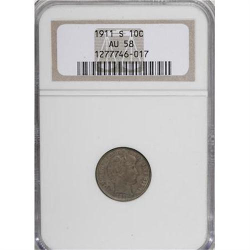 <B>1911-S 10C AU58 NGC.</B></I> NGC Census: (9/148). PCGS Population (16/214). Mintage: 3,520,000. Numismedia Wsl. Price for NGC/PCGS coin in AU58: $115. (#4859)<BR><BR><B>Coin Engraver:</B> Charles E. Barber<BR><BR><b>Shipping:</b> Coins & Currency (<a target="_blank" href="http://www.heritageauctions.com/common/shipping.php">view shipping information</a>)