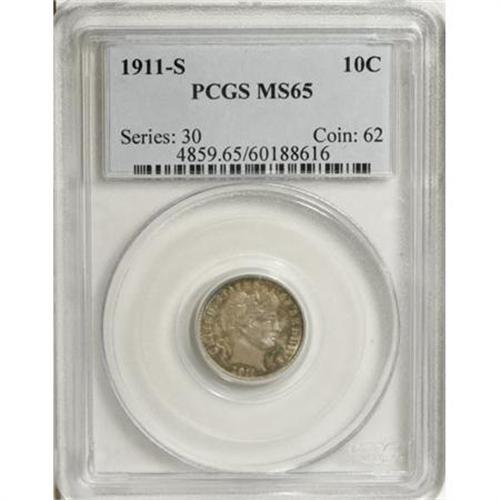 <B>1911-S 10C MS65 PCGS.</B></I> An exceptionally pleasing, late-date Barber dime. The surfaces are nicely frosted and each side is covered with rose-gray and sea-green toning. Sharply struck.<BR><BR><B>Coin Engraver:</B> Charles E. Barber<BR><BR><b>Shipping:</b> Coins & Currency (<a target="_blank" href="http://www.heritageauctions.com/common/shipping.php">view shipping information</a>)