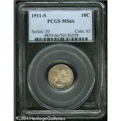 1911-S 10C MS66 PCGS. Splendid gold and champagne <B>1911-S 10C MS66 PCGS.</B></I> Splendid gold and champagne toning are blended to provide exceptional aesthetic appeal. This lovely Gem has underlying frosty silver luster. Well struck, save for some softness in the hair above Liberty's forehead, and on the wheat kernels at the upper reaches of the wreath. Only a few examples of this issue have survived as nice as this, as intimated in the population figures. Population: 43 in 66, 7 finer (10/04). <BR><BR><B>Important notice:</B> Heritage usually auctions material at the rate of 200-250 lots per hour. On some occasions eBay Live bid software or the Internet may not be able to keep up with the pace of the auction. We recommend placing a realistic absentee bid now as insurance to avoid disappointment. Occasionally the auctioneer may eliminate or reject an eBay Live bid, and the auctioneer may also reopen a lot after the close of the eBay live bidding (usually because we missed an audience bid), and may reject your bid even if it shows you as the winning bidder. By bidding via eBay Live, you agree that Heritage may award the lot to another bidder at its sole discretion under the circumstances described above or any other reasonable circumstances. Since eBay bids are not shown to us until we open the lot on the floor, we treat those bids just like floor bids. In most cases the floor responds before the eBay bid is presented to us, due to Internet lag time, so for consistency we have made it a policy that floor bids are always considered first over tie eBay live bids. Also please note that all Heritage lots purchased through eBay Live carry a 20% Buyer's Premium. Please make sure you read the Terms and Conditions before you bid. This lot is being auctioned in conjunction with a live floor auction by Heritage Galleries & Auctioneers. All final auction and invoice information will be supplied by Heritage Galleries & Auctioneers, and all other information should be considered preliminary. Lot:5778