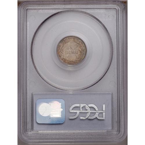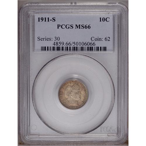 <B>1911-S<10C> MS66 PCGS.</B></I> Warm light golden-brown patina in the centers is framed by a narrow band of sea-green color around the margins, all of which overlies soft luster. No mentionable contact marks are apparent on this attractive S-mint Barber dime. Population: 37 in 66, 8 finer (1/06).