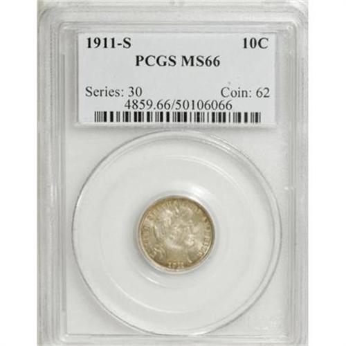 <B>1911-S 10C MS66 PCGS.</B></I> Delicate golden-brown patina in the centers cedes to sea-green color around the margins. Softly lustrous, well-defined, and undeniably appealing. PCGS has certified eight finer examples (1/08).<BR><BR><B>Coin Engraver:</B> Charles E. Barber<BR><BR><b>Shipping:</b> Coins & Currency (<a target="_blank" href="http://www.heritageauctions.com/common/shipping.php">view shipping information</a>)