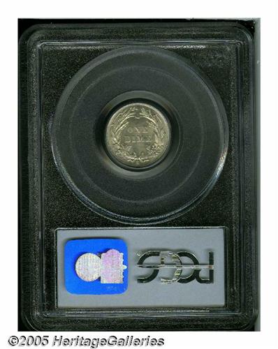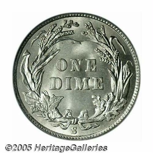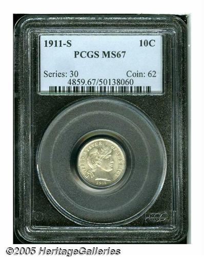 <B>1911-S<10C> MS67 PCGS.</B></I> While the 1911-S could not be considered an absolute rarity with a mintage of 3.52 million pieces, at the MS67 level it is a coin that is seldom seen. In fact, only six other PCGS coins have been so graded with none finer, while NGC has certified three with one finer (4/05). This is an exceptionally pleasing coin that displays soft, frosted mint luster that rolls around each side unimpeded by any meaningful post-striking impairments. An extraordinary Condition Census coin.