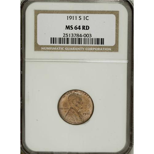 <B>1911-S 1C MS64 Red NGC.</B></I> Sharply struck and thoroughly lustrous with bright red-gold fields and devices. The whisper of carbon is expected of the grade. The early branch mint cents are hard to acquire in full Red, probably due to low mintages and a smaller number of West Coast and midwest collectors. Census: 31 in 64 Red, 29 finer (4/07).<BR><BR><b>Shipping:</b> Coins & Currency (<a target="_blank" href="http://www.heritageauctions.com/common/shipping.php">view shipping information</a>)