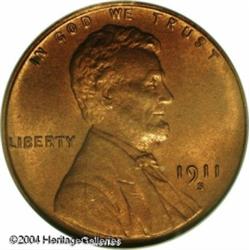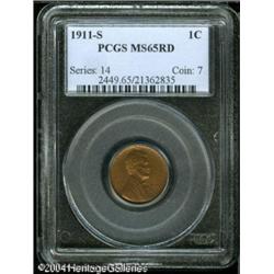 1911-S 1C MS65 Red PCGS. Pinpoint striking definit <B>1911-S 1C MS65 Red PCGS.</B></I> Pinpoint striking definition is definitely one of the major attributes of this scarce, semi-key early Lincoln Cent. The surfaces also display deep, brick-red mint luster and, as one would expect from a Gem, there are no obvious abrasions on either side. Very scarce in such a superior state of preservation. Population: 52 in 65, 11 finer (10/04). <BR><BR><B>Important notice:</B> Heritage usually auctions material at the rate of 200-250 lots per hour. On some occasions eBay Live bid software or the Internet may not be able to keep up with the pace of the auction. We recommend placing a realistic absentee bid now as insurance to avoid disappointment. Occasionally the auctioneer may eliminate or reject an eBay Live bid, and the auctioneer may also reopen a lot after the close of the eBay live bidding (usually because we missed an audience bid), and may reject your bid even if it shows you as the winning bidder. By bidding via eBay Live, you agree that Heritage may award the lot to another bidder at its sole discretion under the circumstances described above or any other reasonable circumstances. Since eBay bids are not shown to us until we open the lot on the floor, we treat those bids just like floor bids. In most cases the floor responds before the eBay bid is presented to us, due to Internet lag time, so for consistency we have made it a policy that floor bids are always considered first over tie eBay live bids. Also please note that all Heritage lots purchased through eBay Live carry a 20% Buyer's Premium. Please make sure you read the Terms and Conditions before you bid. This lot is being auctioned in conjunction with a live floor auction by Heritage Galleries & Auctioneers. All final auction and invoice information will be supplied by Heritage Galleries & Auctioneers, and all other information should be considered preliminary. Lot:5227