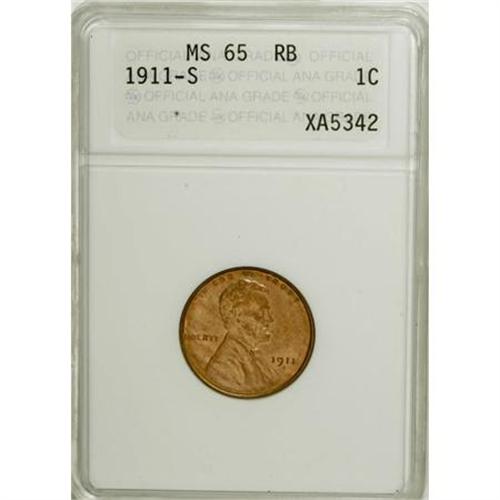<B>1911-S 1C MS65 Red and Brown ANACS.</B></I> A lustrous and highly pleasing straw-gold Gem that approaches full red despite a blush of charcoal-gray near 11 o'clock on the reverse. In an ANA cache holder.<BR><BR><B>Coin Engraver:</B> Victor D. Brenner<BR><BR><b>Shipping:</b> Coins & Currency (<a target="_blank" href="http://www.heritageauctions.com/common/shipping.php">view shipping information</a>)