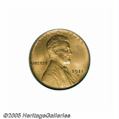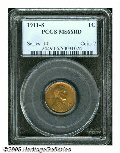 <B>1911-S<1C> MS66 Red PCGS.</B></I> An elusive issue even in the finer circulated grades, the 1911-S is a significant condition rarity at the Gem Red level of preservation. This premium survivor offers pleasing eye appeal, solid technical quality, and a tantalizingly low certified population at PCGS. Rich medium orange luster overlays both sides and highlights the sharp striking definition that characterize most Cents of this issue. A few wispy and not individually distracting blemishes are well within the confines of the MS66 grade level. Population: 11 in 66, 0 finer (6/05).<BR><I>From The William Bickel Collection, Part One.</B></I>