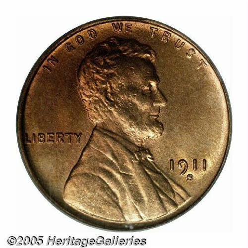 <B>1911-S<1C> MS66 Red PCGS.</B></I> Many of the early Lincoln Cents are quite challenging in Gem or better, full red condition, and the 1911-S is no exception. A lower mintage issue, only a little over 4 million Cents were struck at San Francisco this year. The strike is on this top quality semi-key is boldly impressed and splendid cherry-orange color equally overlays each side. Population: 11 in 66, none are finer (3/05).<BR><I>From The Tom Mershon #2 All-Time PCGS Registry Set of Lincoln Wheat Cents.</B></I>