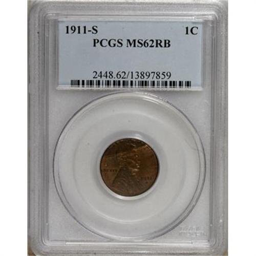 <B>1911-S 1C MS62 Red and Brown PCGS.</B></I> PCGS Population (5/273). NGC Census: (7/168). Mintage: 4,026,000. Numismedia Wsl. Price for NGC/PCGS coin in MS62: $165. (#2448)<BR><BR><B>Coin Engraver:</B> Victor D. Brenner<BR><BR><b>Shipping:</b> Coins & Currency (<a target="_blank" href="http://www.heritageauctions.com/common/shipping.php">view shipping information</a>)