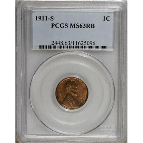 <B>1911-S 1C MS63 Red and Brown PCGS.</B></I> PCGS Population (54/217). NGC Census: (25/142). Mintage: 4,026,000. Numismedia Wsl. Price for NGC/PCGS coin in MS63: $200. (#2448)<BR><BR><B>Coin Engraver:</B> Victor D. Brenner<BR><BR><b>Shipping:</b> Coins & Currency (<a target="_blank" href="http://www.heritageauctions.com/common/shipping.php">view shipping information</a>)