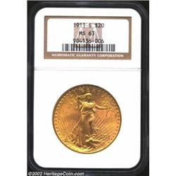 1911-S $20 MS63 NGC. Sharply struck with attractive mint luster, the reddish-gold surfaces are not e