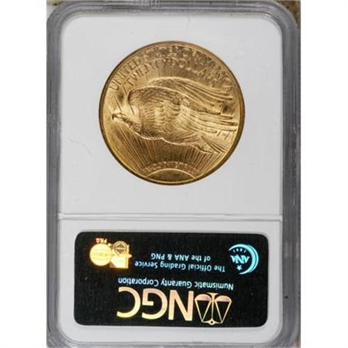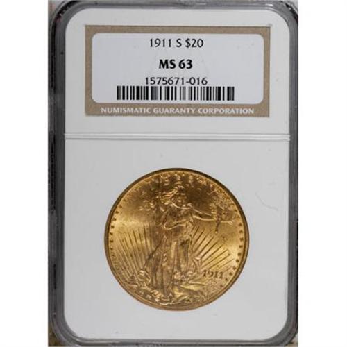 <B>1911-S $20 MS63 NGC.</B></I> The lustrous, carefully preserved surfaces display fine grain textures in the fields. Yellow-gold and rose coloration adorns both sides. The design elements are well struck throughout. <BR><BR><B>Coin Engraver:</B> Augustus Saint-Gaudens<BR><BR><b>Shipping:</b> Coins & Currency (<a target="_blank" href="http://www.heritageauctions.com/common/shipping.php">view shipping information</a>)