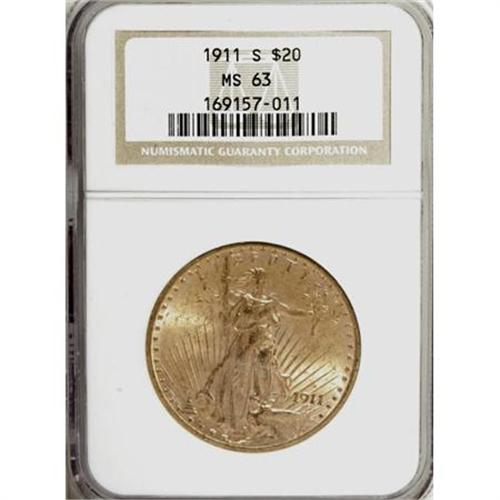 <B>1911-S $20 MS63 NGC.</B></I> NGC Census: (1587/1586). PCGS Population (946/1568). Mintage: 775,750. Numismedia Wsl. Price for NGC/PCGS coin in MS63: $940. (#9159)<BR><BR><B>Coin Engraver:</B> Augustus Saint-Gaudens<BR><BR><b>Shipping:</b> Coins & Currency (<a target="_blank" href="http://www.heritageauctions.com/common/shipping.php">view shipping information</a>)